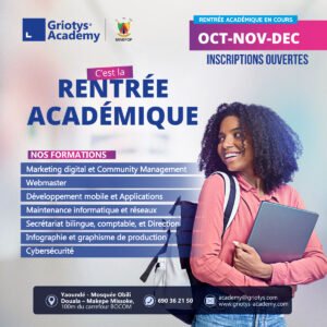 GRIOTYS DIGITAL ACADEMY, numéro 01 des formations et certifications professionnelles dans les métiers du numérique au Cameroun et en Afrique centrale. Nous formons les hauts cadres d’entreprise, les entrepreneurs, jeunes travailleurs et étudiants dans la maîtrise des métiers du numérique, afin de leur permettre d’acquérir des compétences qui répondent au marché du numérique dont le monde à l’obligation de s’y rythmer depuis quelques années.
